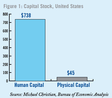 The human capital stock is probably over-estimated since it imputes the value of non-market time at market wages but even counting non-market time at zero (not correct either) would give a human capital stock of $212 trillion, about 5 times the physical capital stock. Thinking about human capital reminds us that debates about immigration and education are debates about investment.