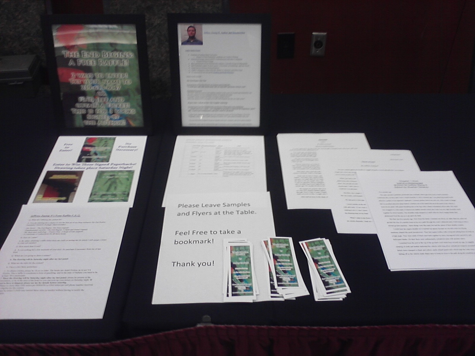 Me! Get to chat with me about writing, life, or your favorite popcorn!Information about my current work, upcoming work, schedule for the day!FREE Bookmarks! (Limited Amounts) (Ps. They'll have promo codes to get free digital versions of my book.)A Free Raffle for a set of my books: The End Begins, The Nine - Project Nine - and Saint and Sinner!Now you might think to yourself: What is this raffle you're holding? And how can I get in on it?