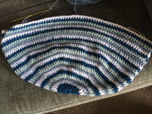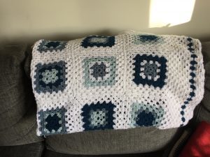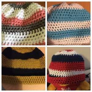 My first attempts have been wobbly and wavy but I’m definitely getting better! I’ve managed a couple of scarves, a blanket and lots of hats (if you stand still for long in my house you’ll get a hat!). We go on a group holiday for a week once a year and myself and two friends are trying to crochet hats for all 35 of us!! Just a bit of fun! Trying to match the colours to a particular thing the wearer is interested in: football teams/cricket/ etc… Here are just a few of them: L: is my hat, I just love the pink and grey combo! R: Blue and white stripe for my Manchester City loving son! Bottom L: A cricket themed hat for a New Zealand fan! Bottom Right: Red, white and blue for my boy who is going to live in England early next year.