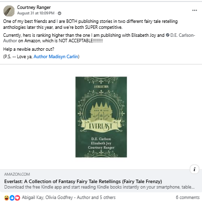 If you currently unable to preorder, you can still help me in this battle. Share about EVERLAST on your socials. Put it on your TBR on Goodreads. Share about the competition and that you’re rooting for COURTNEY RANGER.