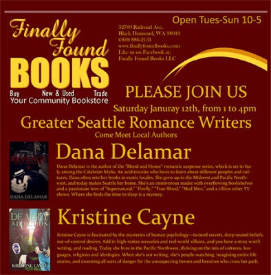 I'll be signing books this Saturday, January 12th, from 1-4 PM at Finally Found Books in Black Diamond with Seattle-area local romance authors Kristine Cayne, Nicolette Reed, Ashlyn Mathews, Darlene Panzera, and Morgan O'Neill. Stop on by! We'd love to meet you!