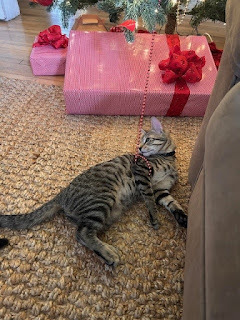 We all know kittens have a magicalattraction to Christmas trees. Charlie, Jordan’s kitten, not yet six monthsold, found the tree this week. Because he’s young and not quite civilized,Charlie has his own suite in the house—what really amounts to the family roomand Jacob’s bedroom. But he gets frequent forays into the rest of the house,and that’s how he found the tree. Charlie is destined to be an indoor cat—in fact,Jordan rescued him when he was about to be turned out to the wide wild world attoo young an age. But sometimes he feels his confinement severely. This morningI watched him march along the windowsills in the family room—the back wall isall window—watching intently as Sophie went about her morning business. He’s apretty cat and, so Jordan tells me, affectionate though playful as kittens are.I have barely met him. To say I’m not a cat fan without explanation is not fairto me—I have adored one cat, my beloved Wynona Judley (affectionately known asWywy), who crossed the bridge several years ago. But Jordan got a kitten inmiddle school that lived to nineteen and was, to my mind, the cat from hell.She peed everywhere, including on furniture, and I had to have a couch andchair reupholstered at great cost because of her. She’d stand right in front ofme and pee on the floor. Graffiti soured me on cat ownership, though if I couldhave another Maine Coon like Wywy I would (she was not purebred, but we’re surethe strain was in there—thick, fluffy coat, pointed ears, sweet disposition).