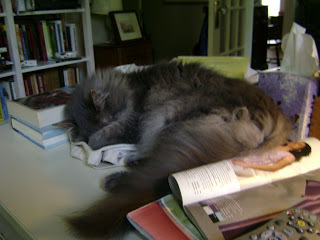 I suspect Charlie will outlastme as a resident of the Alter/Burton compound. And that’s okay with me. I wishhim no harm. I’m just not intrigued. But I have to redeem myself with the manycat lovers among my friends: I absolutely adored Wywy, the cat Jamie found as akitten abandoned on a roadside in Minnesota (do not ask what he was doingthere). For the first year of his life, we thought he was female; after the vetcorrected us (another hilarious story), Wywy lived a life of gender confusion.Today’s aggressive Christians would have had a field day had they known of histransition. We like to believe Wywy was part Maine Coon—he was big, with afluffy gray coat and a wonderful full tail. But beyond that he was sweet andaffectionate, and I loved him dearly. Wywy was helped over the Rainbow Bridgeat the age of nineteen, when he was truly miserable and trying to sneak off tothe back of a closet to die. He holds a special place in my heart yet.Wywy on my desk, ready to help me work