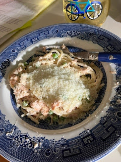 Leftover roast salmon with pasta.