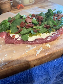 But tonight, with help, Ioutdid myself; a stuffed pork tenderloin and fresh fruit salad. The tenderloinhas cream cheese (I blew through a lot of that this weekend) with fresh spinach,pesto, and bacon. Christian pounded the tenderloin flat for me, and Jordan tiedit into a roll—a family effort. It was delicious, though when Jordan tried toslice it, it “exploded,” and we didn’t get pretty slices. Still, it’sdefinitely a keeper recipe. As I studied it, I decided though the recipe saidtenderloin, it really meant pork loin. For example, it said to bake 60 to 90minutes. If you did that to a tenderloin, you’d have jerky. So I adapted. Andwas pleased with it. And a fruit salad was a pleasant change.