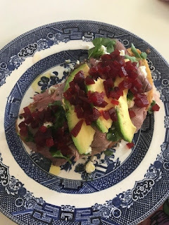 Tonight we brightened the endof the day with an open-faced roast beef sandwich with mayo/horseradish sauce,blue cheese, good peppery watercress, diced beets, and a bit of vinaigrette.Jordan added avocado. It was pretty and delicious, and the day neededbrightening, because I thought overall it was a discouraging day.