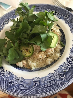 Another experimental dinnertonight. Mary is one of the people for whom I can try out new things, and sheinevitably likes them. Tonight was a rice bowl with tuna, flavored with soy andsesame oil and sparked up with watercress and furikake, a Japanese seasoningmade with dried seaweed, dried fish, dried herbs, etc. I didn’t taste it much,but it did make the dish look pretty.