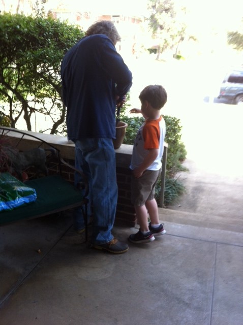 Then Greg put him to work planting, loosening old soil in pots, etc. Jacob loved it--so much better than an out-of-school morning spent watching TV. And my porch is beginning to look like spring again.
