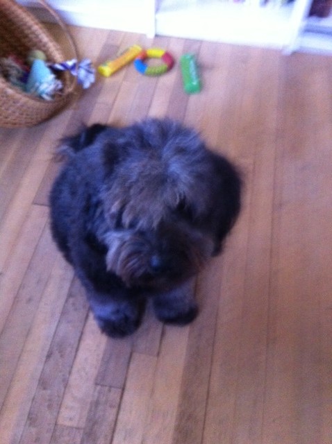 Every morning when I open her crate, she puts her head in my lap and we have a little loving session, although sometimes it's clear she's more anxious for a drink and a path of grass than love. Every night, when I turn out my desk lamp, she picks up a toy, trying to tempt me to play, but I can bribe her with a treat. Then before she crawls into her crate, I get down on the floor, she climbs in my lap, and we sit and love and I talk to her. Sometimes she twists around to lick my face and other times she contents herself with licking my hands or ankles. But when I make a move in the direction of the crate, she goes willingly. I've developed the habit of singing the first lines of "Good night, Irene," to her. Tried to substitute Sophie for Irene (should work--two syllables) but I can't do it. I have no idea if she likes this or finds it an irritation.