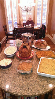And then there’s cooking. I’m used to being the one in charge but hey—this is a daughter’s kitchen or a daughter-in-law’s, and all the other second-generation girls are in the kitchen. Too many cooks—I trip over them. and get in their way. So I do specific things as asked, and when they call out, “Juju, advice please!” I’m there and on hand. I guess we have to all accept a new role for me. I don’t exactly feel like a senior matriarch who needs to be sidelines but maybe in some ways I am. The picture above was meant to show off the beginnings of the holiday feast but since I was in my customary spot at the kitchen table. The results is a picture in which I look—gulp yes—matriarchal.
