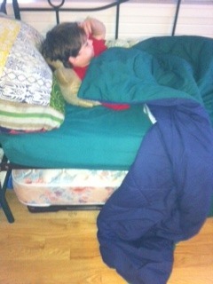 But it's hard to see a six-year-old boy put on his nightshirt (one of his father's T-shirts) and put himself in bed at seven o'clock. That's what he did, and he's watching TV.