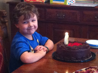 So tonight his Burton grandparents and Aunt Doodie (Christian's sister) joined my neighbors Jay and Susan, good friends Elizabeth and Weldon, former neighbor Meredith with her two little ones (her daughter, two years younger, is one of Jacob'd delights--he ran to tell me "Abby's here!") and my dear friend Aunt Betty in celebrating. Not an imaginative menu--hot dogs, baked beans, leftover potato salad from Saturday, sour-cream onion dip (I overdid on that!), pickled cucumbers (my experiment that everyone loved) and a sinful chocolate mousse cake. Jacob had requested "those little brown sausages" and green peas, and I had promised him whatever he wanted since it was his birthday, so his menu differed from ours. We sat on the porch and visited, while Jacob, Abby, and Poppy played Frisbee and I don't know what else on the lawn. Some ate inside, others outside--lovely evening--and then we all gathered for cake and presents. Jacob was truly excited by each present and ran around giving hugs. Everybody talked at once, and it was a wonderful evening.