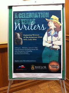 Then a walk clear across campus--a good way--to the Moody LIbrary where we looked at the posters celebrating Texas writers and then collapsed in Starbucks (how modern have campuses gotten?) Then it was time to head to the English building for my talk which seemed to go well--the audience of about 40 was attentive, interested, and sometimes laughed and smiled. It was in a circular tiered classroom, and I had to keep turning my head to take in all of the audience. Afterward, questions, sold some books, a reception, and then dinner in Waco before heading home.