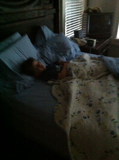 But the night still wasn't over. About one o'clock, he crawled wordlessly into my bed. I really debated whether it was more trouble to endure the kicks, punches, and body slams or to try to maneuver this sound sleeper back to his own bed. I settled for endurance though at times I felt like a battered woman. His favorite place is the middle of the bed, thank you very much. This morning when I asked how he got to my bed, he gave me a look like I am fairly dense and said, "I walked." I asked why, thinking he'd had a bad dream, and he said, "My bed was wet." Swell!