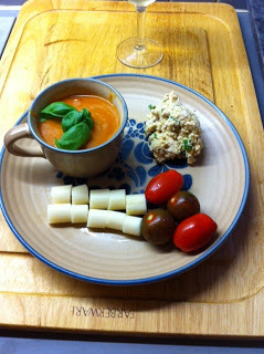 And tonight was my memoir class--a powerful one in which women shared some heavy stuff. I was both grateful and inspired. Linda came for supper beforehand, as she usually does, and I fixed what I thought was a classic light supper: tomato basil soup, tuna salad, cherry tomatoes, and hearts of palm. Notice the funny color of some of the tomatoes--I didn't like those as well. But notice the new stoneware I bought at a garage sale double bargain.