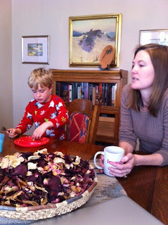 I snuck a nap between lunch and picking up Jacob and slept so soundly that I haven't been much good the rest of the day. I woke suddenly, misread the clock and thought I was late to pick up Jacob--turns out I was early. But I spent much of the rest of the day feeling sleepy and ready to go back to bed. Jacob went to the neighbor's to play and then went out back to play with the dogs--only came in when it dawned on him it was darn cold (he's slow to realize such things). We had supper and Sue, my former neighbor who calls me her Fort Worth mom, came for a drink and catch-up session. We both have a lot going on in our lives, and I was super glad for the exchange--plus we agree about politics and social issues. Good discussion.