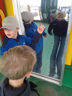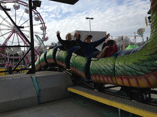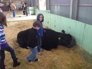 But about 1:30 we headed for the stock show--and we didn't get home until 5:15. That, my friends, is a long day on your feet. This being the last weekend of the show, our visit to the livesetock barns was fruitless--they were empty. We did tour the barn where the winning cattle were--hot, smelly, close atmosphere but interesting, and the kids loved the baby cattle. Then we headed for the midway. I have to be honest: the midway holds nothing but negative appeal for me except for watching my grandchildren have fun. I get tired, grouchy, and, today, cold as the sun faded and the wind picked up. It did have its high moments--Edie won two stuffed fish, and Jacob won a live goldfish; Maddie, Brandon and the Hudgeons boys rode the Ferris wheel, and Maddie and her mom rode The Big Kuhauna. Edie, it turns out, is her grandmother's child and doesn't like rides, though she did some fun and horror house things. Jacob loved some rides, didn't like the others so much. On one, called the Avalanche, people sit in a row and the whole backdrop rotates up and back--looked harmless, but Christian said it had a free fall sort of feeling and Jacob didn't like it at all. There were several most of the adults agreed we would never try.