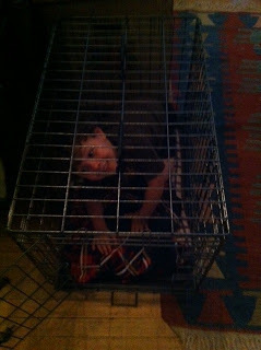 Sophie just drew blood again--she paws at my arm for attention, and we're fighting the"Off!" battle. I say "Off" in my sternest tone and turn my back on her--she refuses to accept that command, and a few minutes later a sneak attack I'm not expecting bloodies my arm.. As a consequence lots of my T-shirts are blood-stained--on the left sleeve. She's also alienated at least one person who was prepared to adore her--8-year-old Edie, a real softie for animals, was so excited about seeing her again (she was with me the day I got her) but lost interest because Sophie jumps so much. Jacob roughhouses and wrestles with her and never seems bothered by her wildness--six months ago he was afraid of dogs. Now, he comes in after school and wants to play with the dogs right away. He sits on the roof of the porch to the doghouse and sometimes hoists Sophie up there with him.