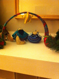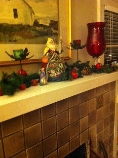 To me, the fireplace mantel is always focal--and always the hardest to do. Today it was the last thing I did, and I thought I'd need Jordan's help to pull it together, but tonight I did it. The main items are the tall red vase, part of the decorations from the Christmas wedding of Jordan and Christian seven years ago, and the Jim Shores Santa with its 12-days of Christmas motif. Newly added is a tiny Jim Shores angel, meant of course to hang on a tree. At the other end of the mantel and is a creche handmade in a small village in Guatemala. Making these creches has brought sustainability to the village, so I like the idea as well as the finished product.