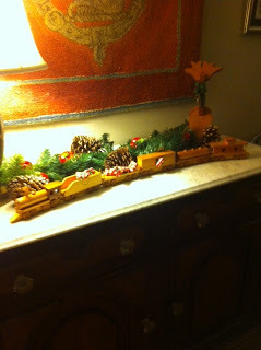 Next on my agenda was the buffet in the living room. Every house should have a toy train at Christmas, so here's the one I put out every year.