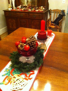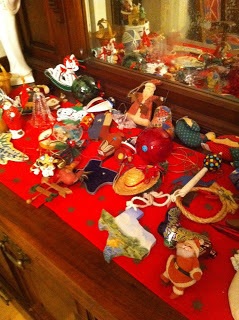 I try to make the dining room table different every year--fairly easy because I can never remember what I did the year before. This year I decided to go with a fairly spare look--no greens except the wreath, which has four holders for tapers that are on my shopping list. The bowl was also part of the wedding decorations. And finally because Christmas should be a time of cutter and randomness, I put out a display of ornaments. This is just a portion of my large collection.