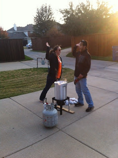My sons and sons-in-law have been frying turkeys with enthusiasm for several years--Colin and Brandon have fryers, and so far we have avoided disasters. Then I saw a truly frightening video on the TODAY show about the disasters that can occur and how many people are seriously injured a year frying turkeys--also houses fried by mistake. So I was relieved I'd with with Jamie and Mel, where I could expect a tradtiional turkey done in the oven. Imagine my dismay when Jamie last night announced he was going to WalMart to buy a fryer. I lectured about dangers to no avail.