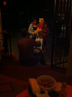 Since I no longer have kids at home--haven't for almost twenty years--I've let Halloween go. It's not much fun to do by yourself--or that's my excuse. Some years when the Frisco girls were young I went there to see them in their costumes; some years I've turned out all the lights and hibernated; for a few years the Texas Book Festival was on Halloween, and I was in Austin. We had a wonderful time--Melinda, KK, and I gave out treats in Megan's yard while she and B took the boys down the street. But the last couple of years, I have a new tradition, thanks to my good neighbors, Susan and Jay. They enjoy Halloween--Jay particularly likes greeting each child, commenting on his or her costume, joking with the parents. He sits on their front steps with an enormous bowl of candy at his feet and doles it out. Susan has made delicious stew both years, so I simply put the dogs up, turn out all my lights, and go next door.