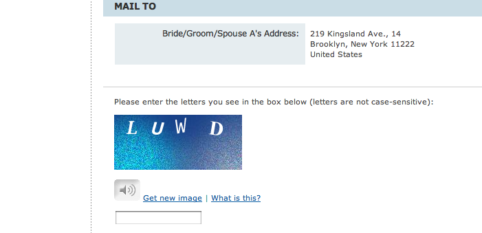 So last night we submitted our application online and were instructed to show up at the City Clerk's office within 21 days with our IDs, Social Security numbers, and preferred brand of condoms so that we can say "I do" and get this shit over with. But before I got to the confirmation page, I was instructed to type the letters "LUWD" into the space in order to prove that my application was not gay spam.