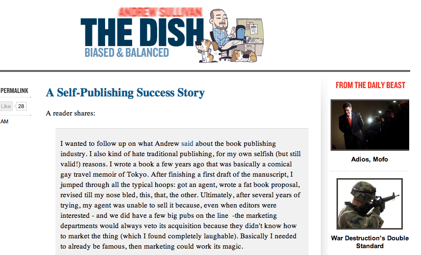 Wow, this is really quite something. I've been reading Andrew Sullivan's blog religiously for about 5 years, ever since he became the only conservative voice out there who wasn't a completely delusional nutbag. In fact, he's one of the most clear-thinking and intellectually honest writers I've ever encountered. Anyway, one of the great things about his blog is that, though it's heavily weighted towards politics, it also covers a lot of other great topics that are out there--among them religion vs. atheism, marijuana use among MANY Americans, scientific debates, and, most importantly, the Pet Shop Boys. It's all there. And one of his pet topics is how much he loathes the publishing industry. He did a video response last week to a reader who asked why he hates the publishing industry so much, which was fun. I wrote a letter to him and his team in response and yesterday they ran the letter and, even though I didn't mention the name of the book in my letter (I dropped big clues, but I didn't want to be too unseemly--it's bad to dress like a pimp when you're pimpin'), they actually found the book on Amazon and included hyperlinks for folks to buy it OMG!