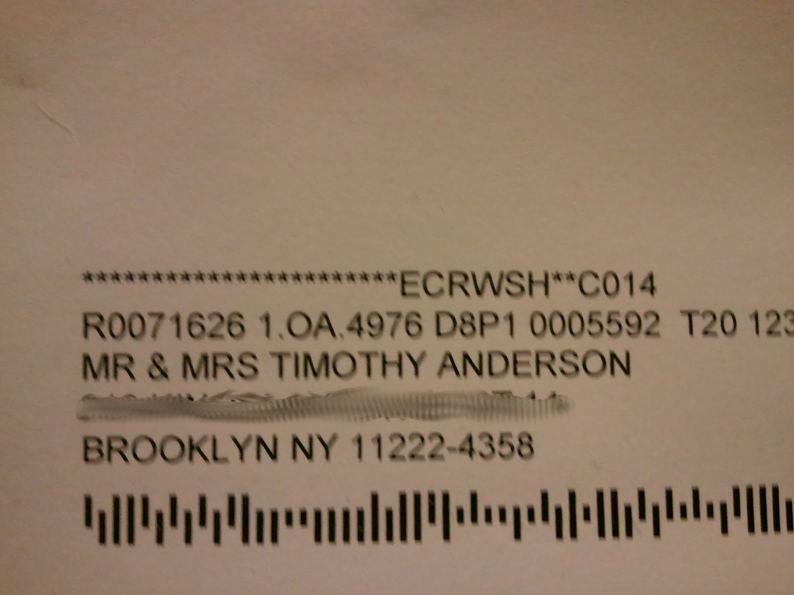 Anyway, this week we finally received our first piece of joint junk mail. (See picture above.) Whatwoulditbe? Whatwoulditbe? What. Would. It. Be? A pre-approved credit card application? A chance to jointly donate to the SPCA or the Recall President Leviticus campaign? A hilariously misguided set of coupons for Home Depot? No, none of these. Here's who it was from: