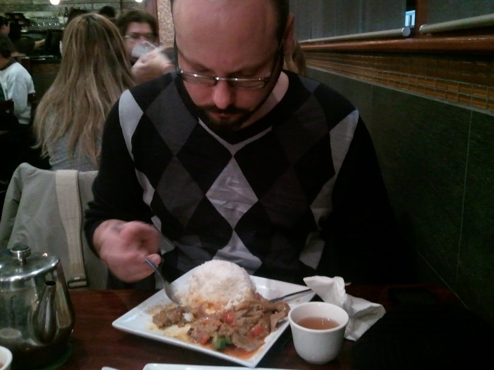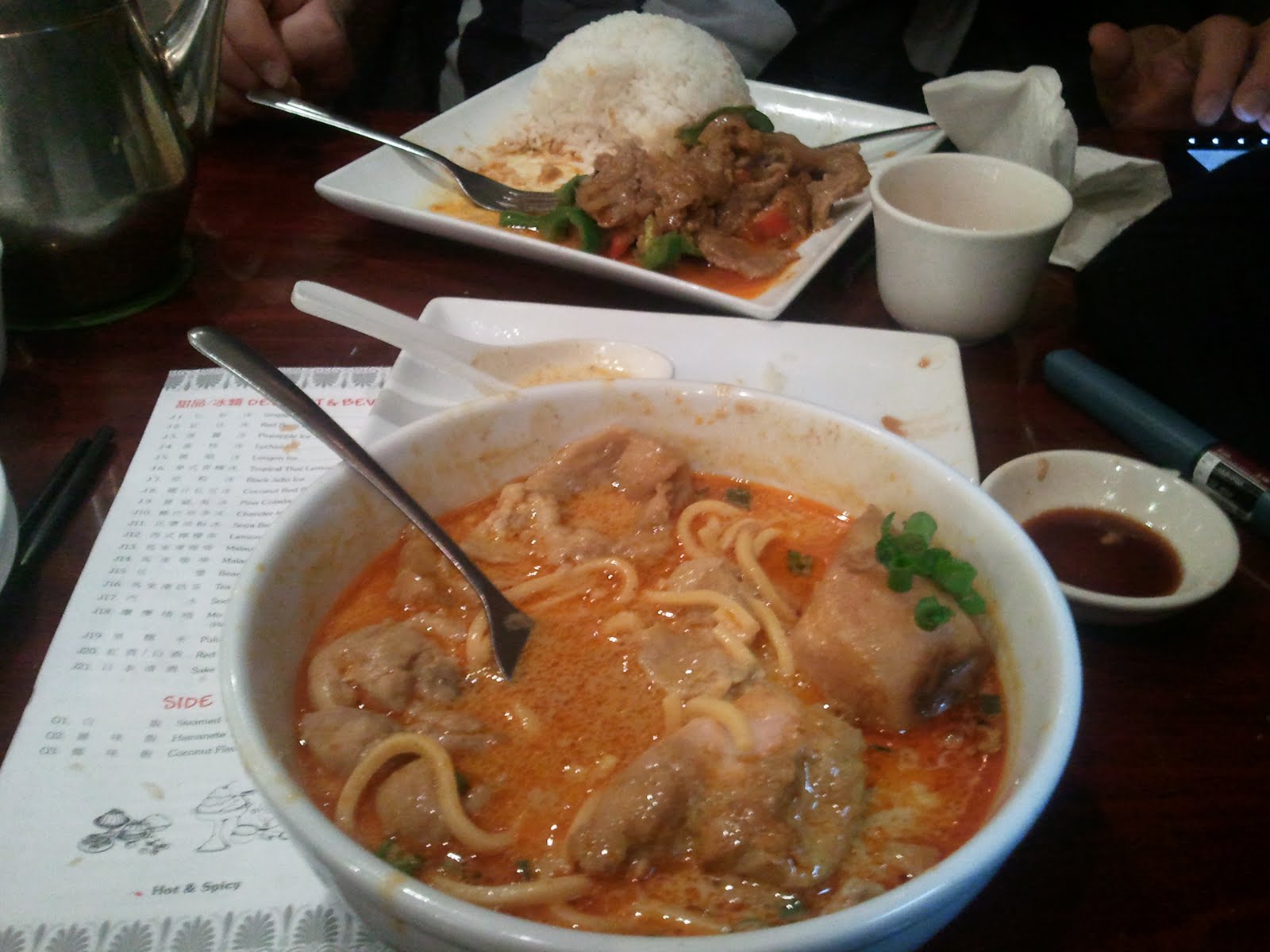 Jimmy and I had our usual Christmas-day-in-Chinatown face stuffing. The picture up top is my curry chicken noodle soup and above is Jimmy making his way through beef something-or-other with rice. His hand is blurry because he's eating fast, in order to eat more. After Christmas, I headed down to Raleigh to see the family AND to have a Tune in Tokyo event at Humble Pie downtown on the 28th, yay! Stella didn't want me to go: