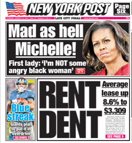 Anyway, so of course the media are going to cover this response of hers, and unfortunately the New York Post is classified as "the media," so of course we were bound to see something about this on the famously right-wing daily's front page this morning. And what did the bilious baboons over at the Post decide was the best headline for this story? That's right: Mad as Hell Michelle!