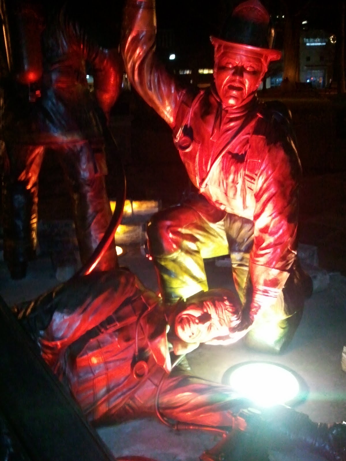 After stopping in at Brewmasters to stuff our faces full of THE AWESOME FOOD THERE, we walked through Nash Square back to Kevin's car and for the first time I saw the firefighters memorial that had been erected there in 2006. It was all lit up so I took a picture...