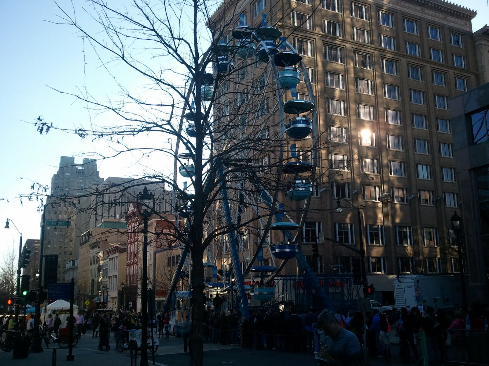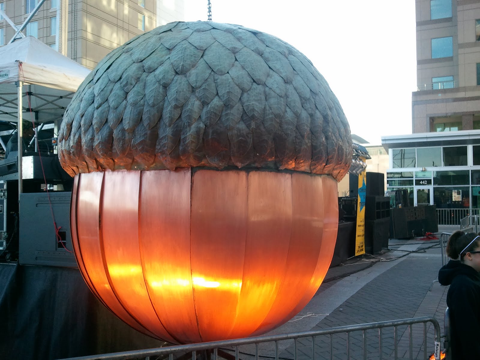 On New Year's Eve afternoon, Kevin and I went downtown to Fayetteville Street because we heard there was going to be a Ferris Wheel in the middle of the street. I wanted to ride it! Sadly, the line was way too long because it was the only fun, non-alcoholic thing on offer at the time, so we didn't bother. But we did keep walking because I wanted to see the big acorn that always drops from a crane as Raleigh's answer to Time's Square's juicy apple. It wasn't hoisted onto the crane at the time so I was able to get a close-up.