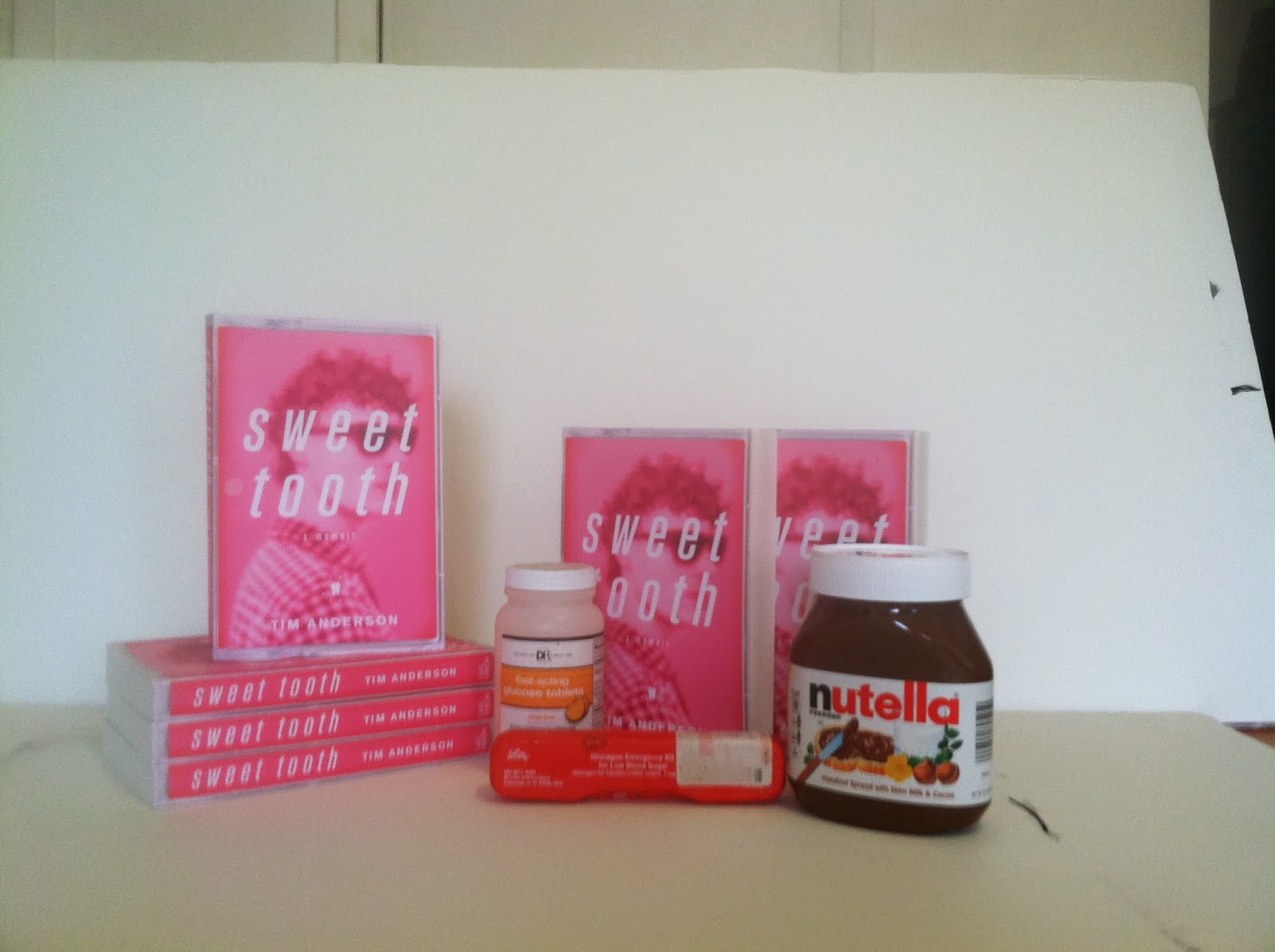 , which chronicles my adolescence as a poor gay boy who loves sweets, and my cat Stella has already staked her claim on all of them. Jimmy said she's spent all day stacking them in different formulations. The one below is particularly poignant, as it really gets to the heart of the experience of a diabetic who loves Nutella and sometimes has low-blood-sugar episodes.