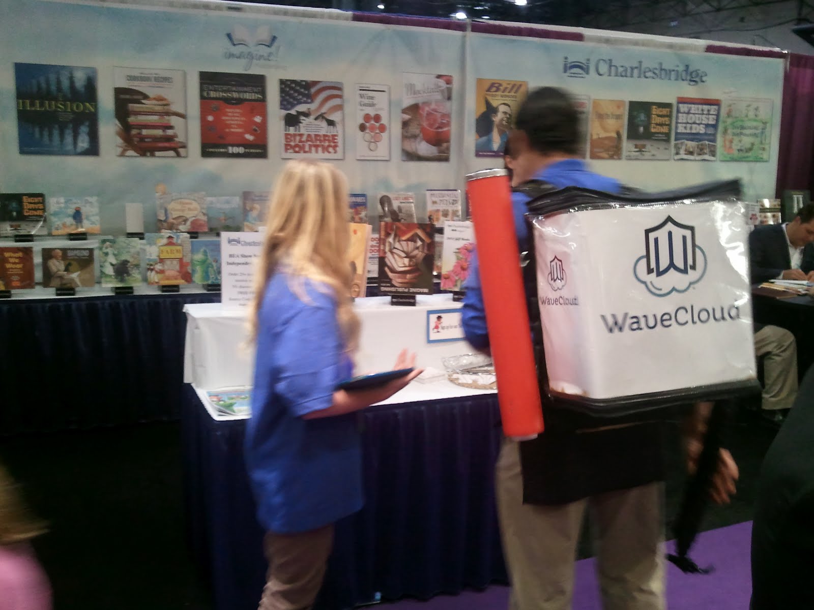 WaveCloud.com is apparently some new "Goodreads"-type site whose mission is to bring authors and readers together, or some such. Do we care? Only kind of! I just searched for my book (Tune in Tokyo, buy it!) on their site and turned up nothing. Nothing! BURN THAT SITE DOWN. Anyway, one of WaveCloud's gimmicky ways of getting notice at BEA was hiring folks to walk around with a big box of hot coffee on their back and a paper cup dispenser, so folks could give themselves a little pick me up. This, I think, falls in the "random" category of BEA happenings.