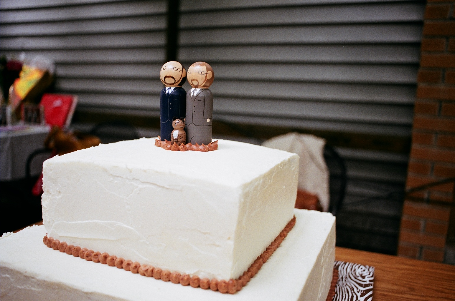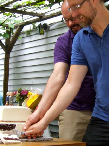 In conclusion, Jimmy and I have been together for 15 years. We met in North Carolina, our home state, and are now finally able to get married because we live in NYC (we actually married on February 13, and are celebrating on June 9) and Ye Olde Breeders of New Yorke have finally stopped being idiots about 21st century reality and are now graciously allowing us to do what we've been doing for a decade and a half, but now with health insurance benefits and such. Don't worry, though, North Carolina will get around to enshrining basic decency in its constitution next century, once it's done enshrining brazen idiocy. To paraphrase the late great Martin Luther King, the arc of the moral universe is long, but it bends toward us gaywads, eventually.