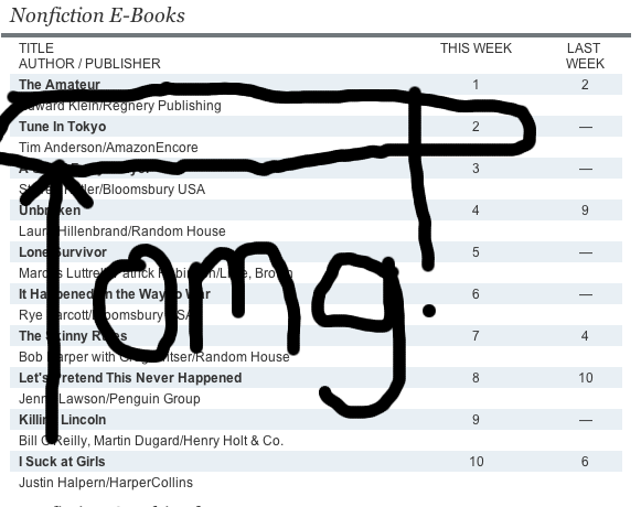 Well this was unexpected! It appears that last week's download-a-palooza over at Amazon in light of the Kindle Daily Deal designation for Tune in Tokyo has somehow led to its being listed on an actual non-Amazon list, hooray! Sure, next week the book will probably have dropped to # a million, but so what/who cares, amiright? This is a day to celebrate the little guy (me) sitting pretty seven slots above the big guy (Bill O'Reilly) who works for Satan's own network (FOX News, duh). Does this mean that Jesus really loves me and thinks Bill is just terrible?