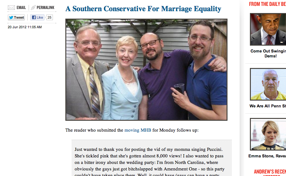 How did that happen? Did I forget my blogger password or something? Anyway, you might remember that last week the video of my mom singing at my wedding party went semi-viral thanks to it being posted on Andrew Sullivan's blog. Well, I wrote back to them to thank them for posting the video, and they asked if I had a photo of Jimmy, me, mom, and her new husband at the party, because they wanted to run my letter as a follow up. So here's that post they did.