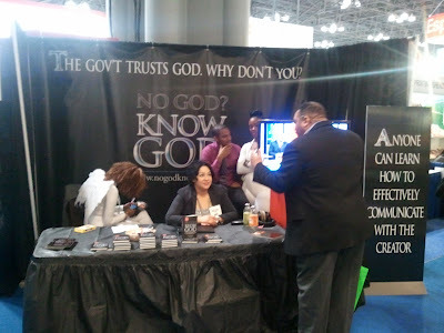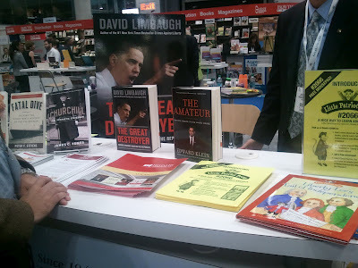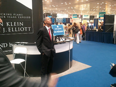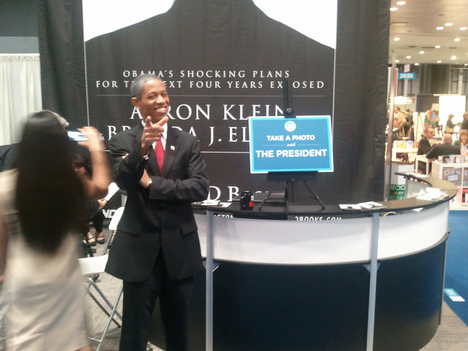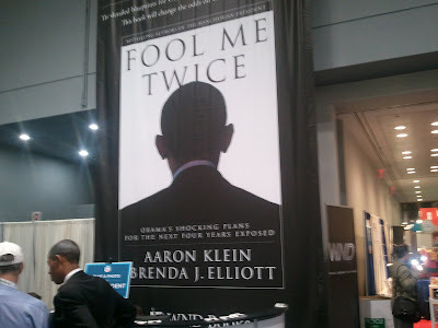 So, this book Fool Me Twice will lay all this out in words that the great unwashed masses of our country's greatest insane asylums can understand. And the publisher's gimmick for generating buzz about the book at BEA was to hire some poor handsome young black man who from behind bears a striking resemblance to our president. (Look at him on the lower right corner of the photo above. They have very similar heads!) He had the perfect sheen of gray on his hair, it was quite amazing. Sadly, the illusion falls apart when he turns around and shows us his handsome face, which bears absolutely no resemblance to our president's handsome face. Still, he's got the gestures and expressions down.