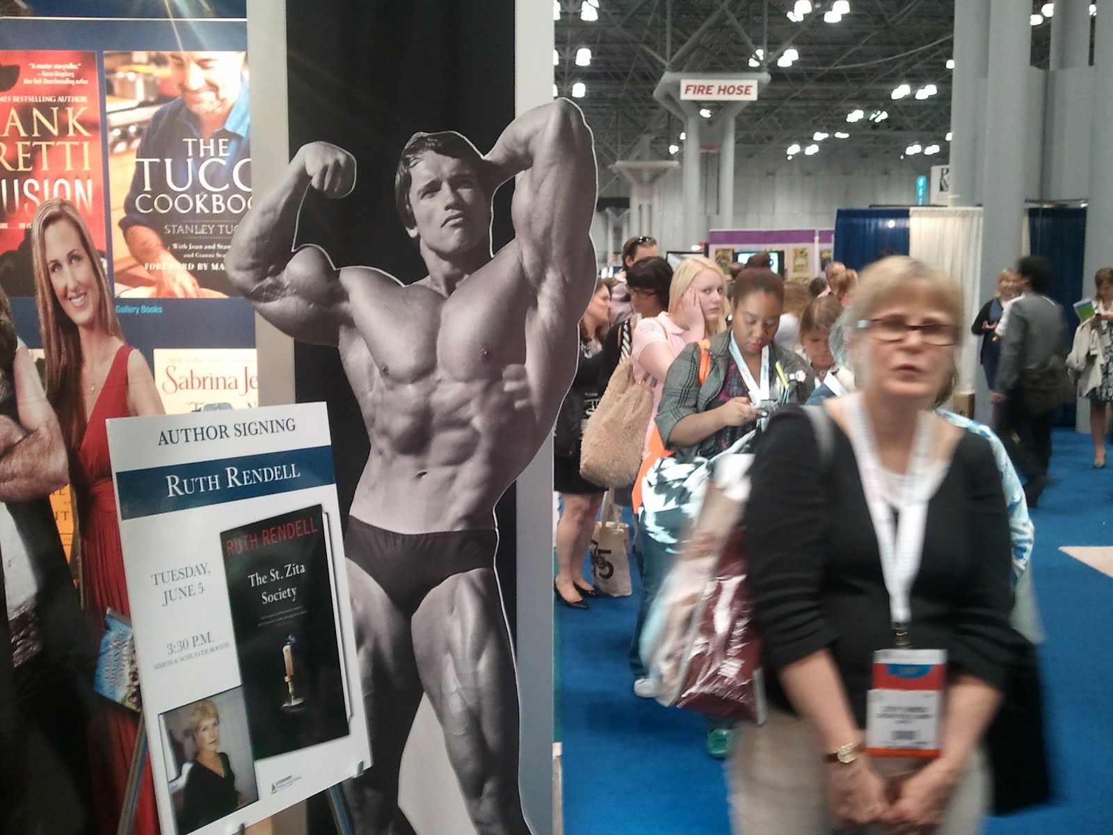 A cardboard cutout of Arnold Schwarzenegger was on hand to sign copies of Ruth Rendell's new book. (Or something, I don't know what's going on here.)