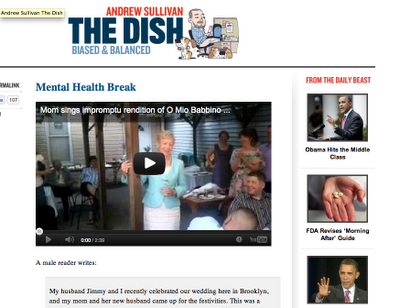 So, the other day I posted a video of my mom singing a Puccini aria at my wedding party a few weeks ago, which you've no doubt viewed and gasped over, because OMG, right? Incredible. Anyway, I sent this video to my favorite blog, The Dish, written/curated by the mighty Andrew Sullivan, as a "Mental Health Break" candidate. You see, his blog is mainly concerned with politics, but once a day he posts a fun video as a pressure release, and I sent in a link to the video along with a note giving context. He posted it a few days later, and momma's gotten almost 9,000 hits on youtube since!