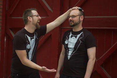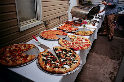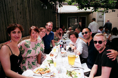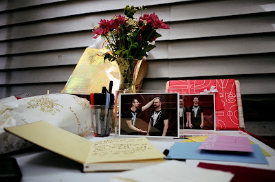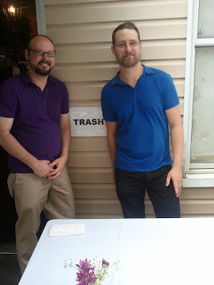 I know that all three of my readers are dying to see some photos from me and Jimmy's wedding party, which took place last weekend, so here we go. Just to review: Jimmy and I have been together for fifteen years, but we just tied the knot this February and finally celebrated on June 9. The above shot is one of our "official" wedding photos, because we are wearing the required T-shirts. Here are some candid shots from the event!