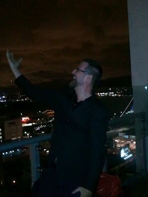So! That's all I have for the floor show, but because I'm not just an intrepid reporter but also an author, I happily twirled on down to the Press Lounge for the Amazon Publishing swaray with my friend Alyson, where there was much free booze and opportunities to pose once again in front of the magnificent Gotham cityscape.