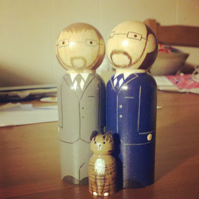 In short, these tiny simulacra have an important job to do, and the ones that our friend Rachel Roth, who is making our wedding cake, got from Etsy bode well for Jimmy and I, because they bear remarkable likenesses to our real selves. Jimmy's (left) is a dead ringer, for in real life, his head is perfectly round, and scientists use it to calibrate their instruments. I've always wished my head was rounder, and this figurine allows me to finally realize that dream, sort of. But it's most important for them to capture our essences, and I think these do. Is it sad that our essences can be captured in figurines that are no larger than five inches? Maybe. But in their defense, my essence can probably be captured in an item much smaller, so I'm feeling pretty flattered by the extra inches. Our cat Stella is pretty happy with her essence, though as always she wishes it was skinnier.