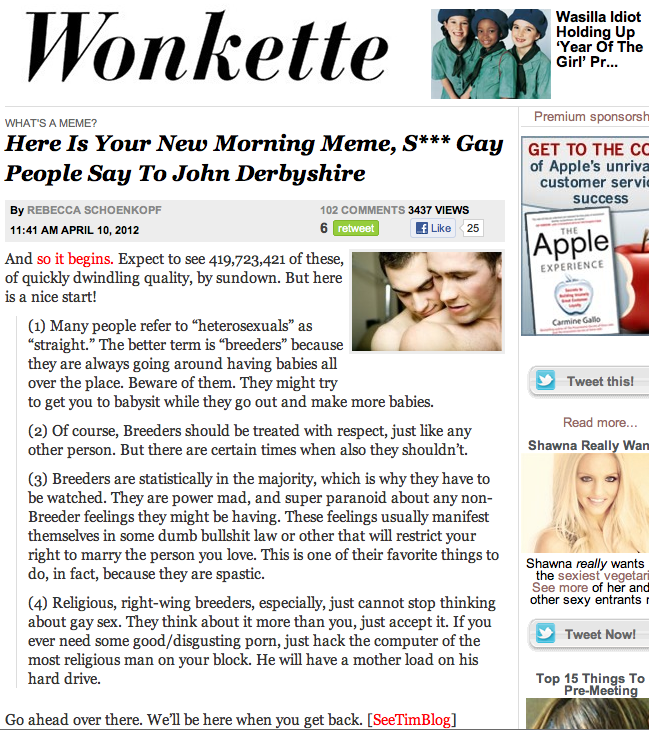 I know people have to write things and get page views for a living, especially the twelve-year-old lackeys over at Nick Denton's Circle Jerk Factory, aka Gawker, so it's incumbent on them to have provocative, link-worthy opinions on everything from NYC media figures no one cares about to John Travolta's massage preferences to the latest side boob extravaganza. They are sometimes very insightful! But shitting on the POTUS for coming out for gay marriage but not doing it exactly as you wanted is just stupid, sorry.