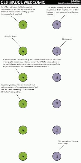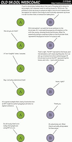 B: So: NFTs! Blockchain was created to act as a ledger for cryptocurrency transactions, but we’ve already talked about how you can write more than just transaction information to it. You can add all kinds of things to it — even pictures — but it’s more common to just add metadata that points to something off the blockchain because it takes up less space.