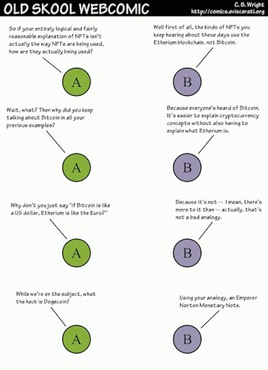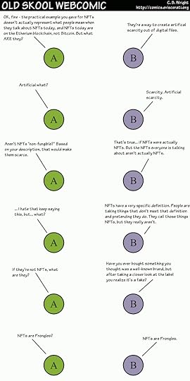 B: Well first of all, the kinds of NFTs you keep hearing about these days use the Etherium blockchain, not Bitcoin.