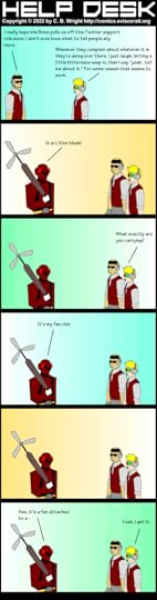 ELON MUSK: (Carrying FAN CLUB.) I’m here to see how the whole “outsource Twitter support to Ubersoft” thing is going.