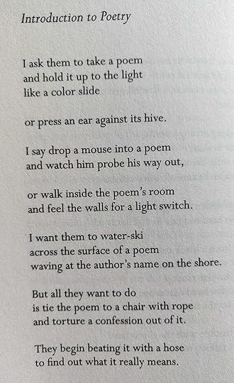 You’ll see a couple familiar names here. In particular, Billy Collins and Mary Oliver, who for me are sort of the mama and the papa of “accessible” poetry (although I wish I could think of a better word for what I mean, because the word ‘accessible’ can sometimes get condescending reactions. But our point here is to ignore that hoity-toitiness.) Then hopefully you’ll find some new goodies too.